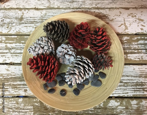 Decorazioni Natalizie Fatte A Mano Con Pigne Colorate E Sassolini Su Piatto Stock Photo Adobe Stock